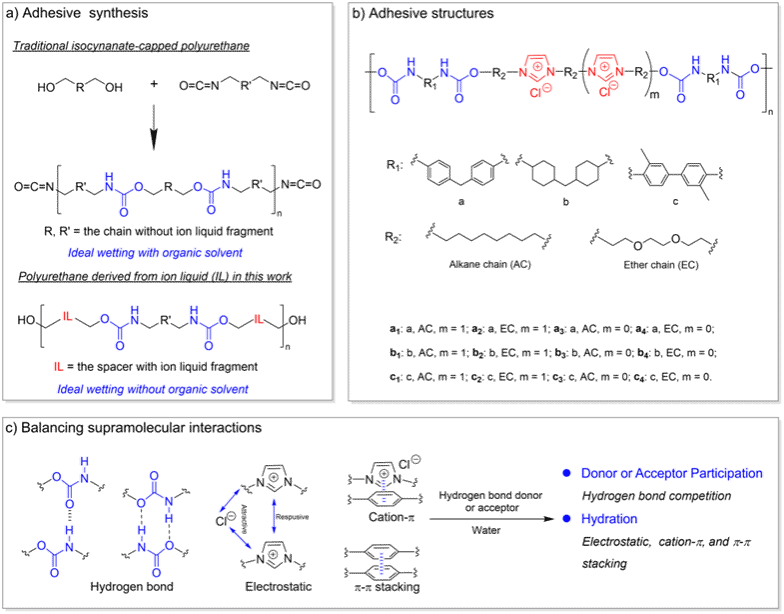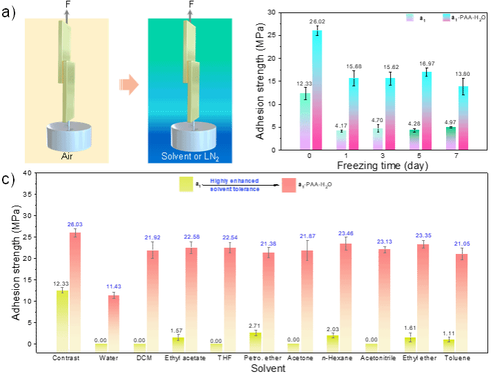 为解决这一问题,本研究采用两步法超分子作用组合策略,显著提升了聚氨酯衍生物的界面润湿性和粘接界面的环境耐受性。首先,通过共价键合的方式,将能够提供静电作用位点并提升界面润湿性的咪唑鎓离子片段以及可提供氢键作用位点的氨酯键引入线性聚合物分子结构中,设计合成了系列具有优异界面润湿性和界面粘附力的离子型聚氨酯(图1)。为了克服溶剂化效应导致的离子型聚氨酯分子间内聚力降低引发的界面失效问题,该研究进一步采用超分子组合策略,引入可调控分子间相互作用平衡的组分(如水与聚丙烯酸等),有效调节离子型聚氨酯与功能添加剂之间的分子间作用(氢键、π-π堆积、阳离子-π相互作用和静电力等),使所得复合胶黏剂不仅具有超强的界面粘接力,而且在水、有机溶剂和液氮等环境中展现出优异的环境耐受性(图2)。其性能优于许多同类有机溶剂辅助的商用胶黏剂及先前报道的超分子粘合剂。通过核磁滴定、变温核磁以及分子动力学模拟等理论与技术手段,研究明确了超分子组合前后分子间作用平衡的变化规律及其作用机制。
