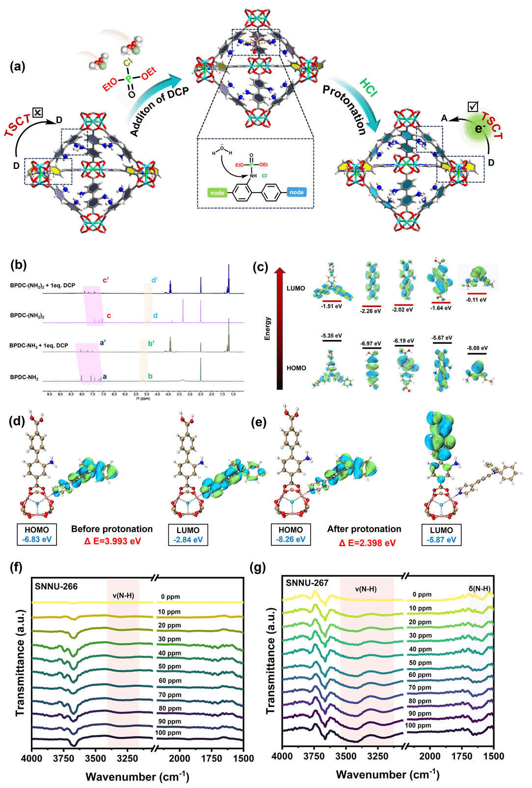 总的来说本研究通过孔空间分区策略,在镁基MOF中实现供体-受体的精准空间排布,构建质子化诱导的TSCT传感平台。SNNU-266与SNNU-267中的氨基在DCP作用下质子化形成-NH3+受体,与TPPA供体发生高效TSCT,导致荧光猝灭与红移,在液/气相中均实现DCP的超灵敏检测(液相LOD 0.017 ppm、气相LOD 0.04 ppm),响应时间<10秒且循环稳定。该工作不仅证实PSP策略对MOF中TSCT的精准调控能力,还为神经性毒剂模拟物的快速、超灵敏检测提供实用化方案,为荧光传感机制调控与危险化学品检测材料的设计提供“结构分区-机制调控-性能优化”的系统范式。