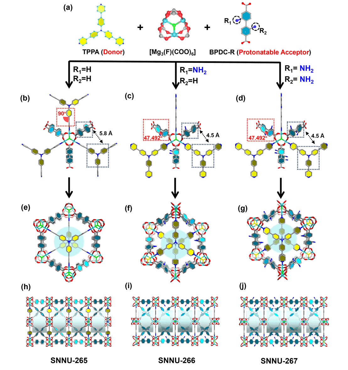 本工作以TPPA为孔分区配体(电子供体),分别与BPDC、BPDC-NH2、BPDC-(NH2)2三种二羧酸配体(质子响应型电子受体),通过溶剂热法与硝酸镁反应生成三例MOF材料。X射线单晶衍射显示,三者均含三[Mg3(F)(COO)6]次级结构单元,但配体构象与对称性不同:SNNU-265中BPDC呈共平面构象,属六方晶系P63/mmc空间群;SNNU-266与SNNU-267中氨基取代配体扭转角约47.5°,属四方晶系I41/amd空间群。TPPA将MOF的一维通道分隔为笼状亚单元,实现TPPA(D)与BPDC衍生物(A)的有序空间排列。