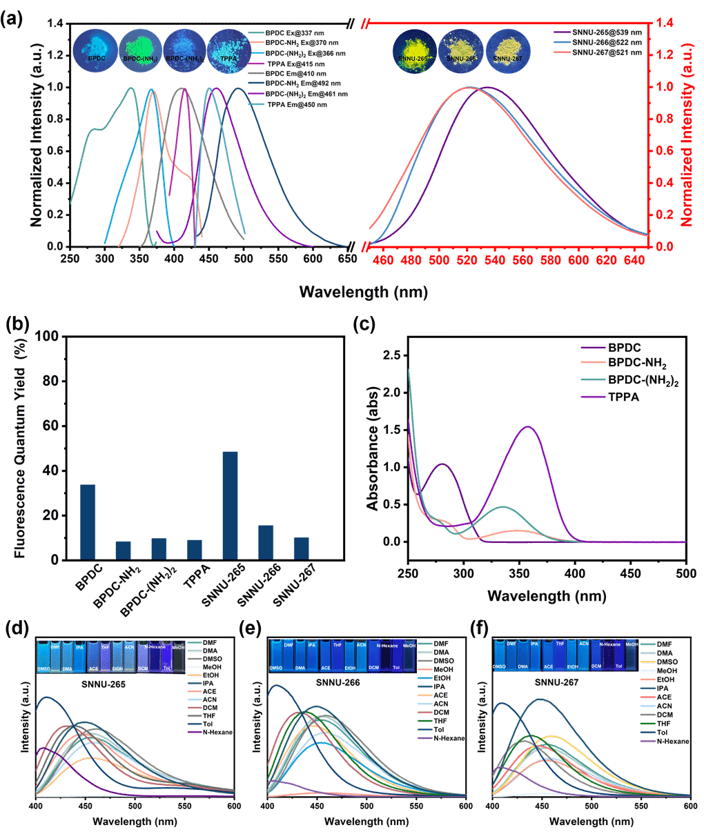 固态荧光结果表明,TPPA发光源于分子内电荷转移(ICT),氨基取代配体因给电子效应导致红移。SNNU-265–267的发光主要来自TPPA,因框架刚性增强进一步红移。量子产率测试显示MOF整体PLQY高于游离配体,但SNNU-266与SNNU-267因吸收重叠略低。溶剂效应表明,其在质子溶剂中发光减弱、在非质子溶剂中随极性增强红移。